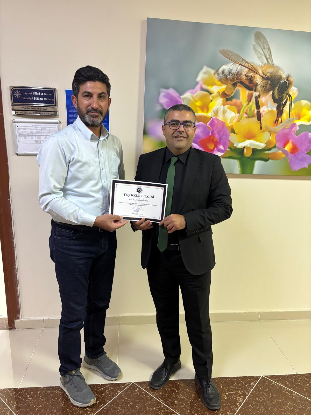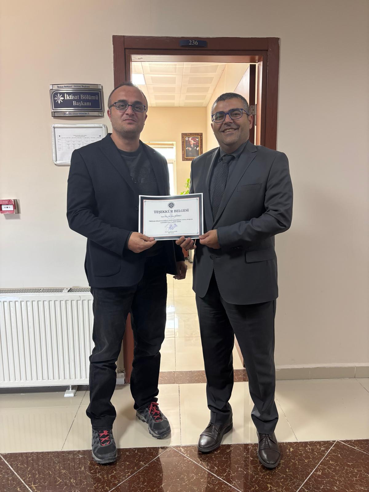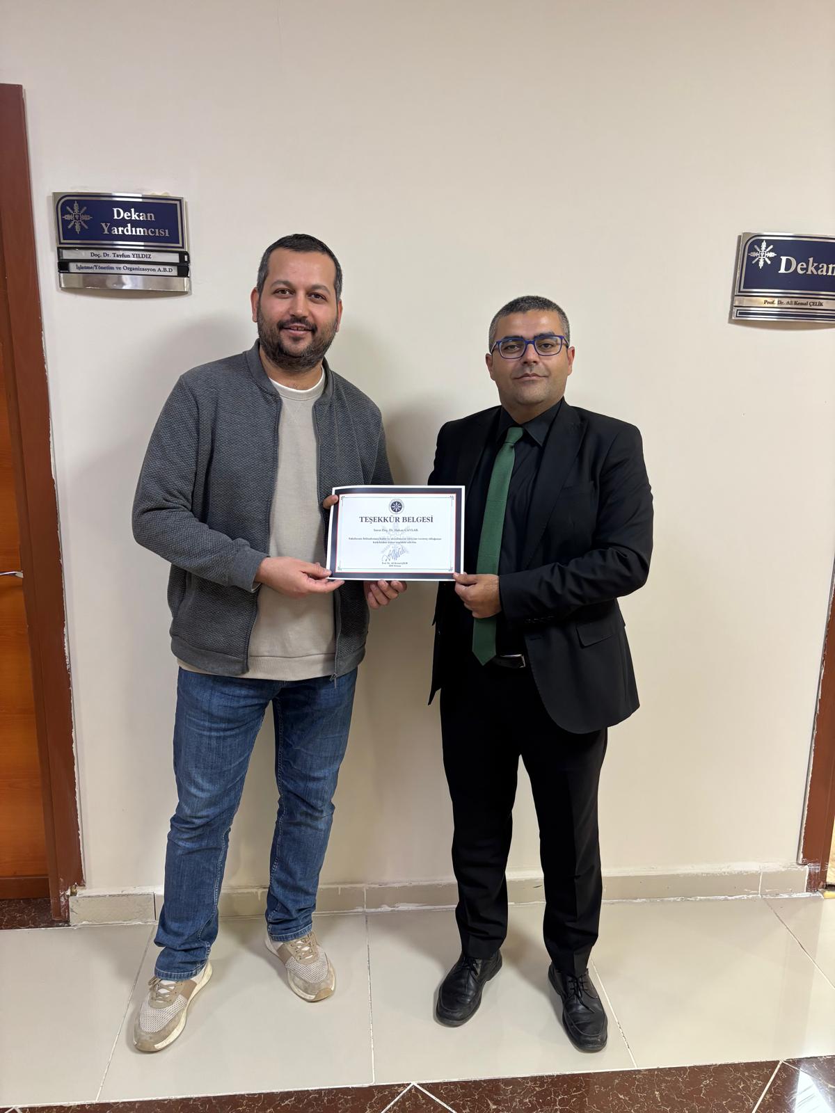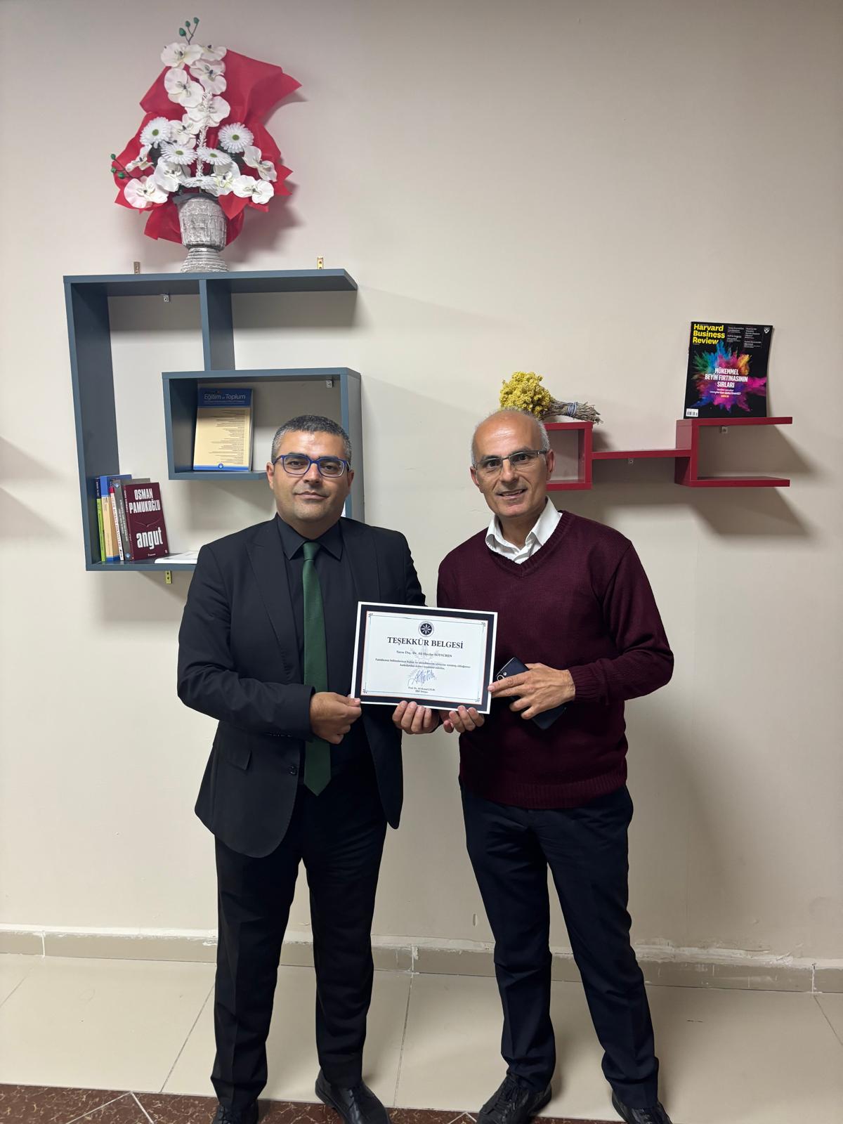 Dekanımız Prof. Dr. Ali Kemal ÇELİK, kalite sürecindeki özverili çalışmalarından ve STAR Akreditasyon şirketinin yerleşke ziyareti sırasındaki emeklerinden ötürü tüm akademik ve idari personele teşekkür belgesi takdim etti. Dekanımız belge takdimi esnasında; "Kalite ve Akreditasyon sürecimizdeki önemli katkıları için tüm akademik ve idari personel için teşekkür belgesi hazırlanmış olup ilgili belgeler temsili olarak Bölüm Başkanlarımıza teslim edilmiştir. Tüm akademik personel teşekkür belgesini Bölüm Başkanlarından, idari personel ise Fakülte Sekreterliğinden alabilecek olup sürece katkıları için tüm öakademik ve idari personelimize tekrar çok teşekkür ediyorum" dedi.