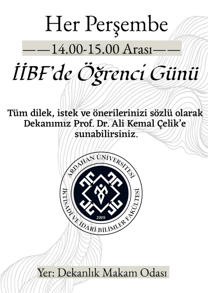İktisadi ve İdari Bilimler Fakültesi, Dekan-Öğrenci Görüşmesi programını hayata geçirdi. Program kapsamında her Perşembe 14.00-15.00 saatleri arasında öğrenciler Dekanımız Prof. Dr. Ali Kemal Çelik'e talep, istek ve önerilerini yazılı ya da sözlü olarak doğrudan iletebileceklerdir. Öğrenci merkezli anlayışımızın bir parçası olarak, şüphesiz en önemli paydaşımız olan öğrencilerimiz ile etkin ve etkili iletişim kurmaya devam edileceğini bildirir, kıymetli öğrencilerimizi her Perşembe Dekanlık Makamına bekleriz.