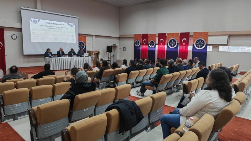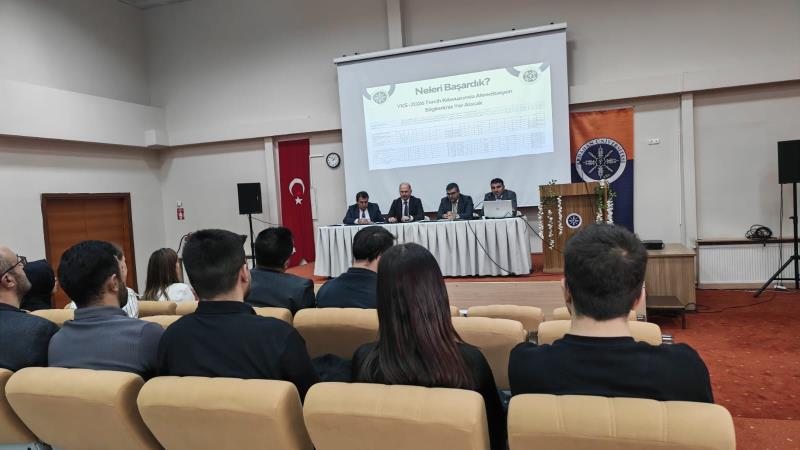 Fakültemiz 2025-2026 Bahar Dönemi Akademik Kurulu, 08.04.2026 tarihinde akademik personel ile kalite elçisi öğrencilerin katılımıyla gerçekleştirildi. Dekanımız Prof. Dr. Ali Kemal Çelik'in tüm bölümlerimizi program akreditasyonu sürecindeki özverili çalışmalarından ve 3 (üç) yıl süreliğini elde edilen akreditasyon sertifikasından ötürü tebrik ederek başlattığı toplantı, ardından Fakülte Kalite ve Akreditasyon Koordinatörü Dekan Yardımcısı Doç. Dr. Cihan Yılmaz'ın akreditasyon sürecine yönelik yol haritasını paylaştığı sunumla devam etti. Bahar dönemine ilişkin mevcut durumun değerlendirilmesinin, öğretim üyelerinin ve öğrencilerin talep ve isteklerinin paylaşılmasının ardından toplantı sona erdi.